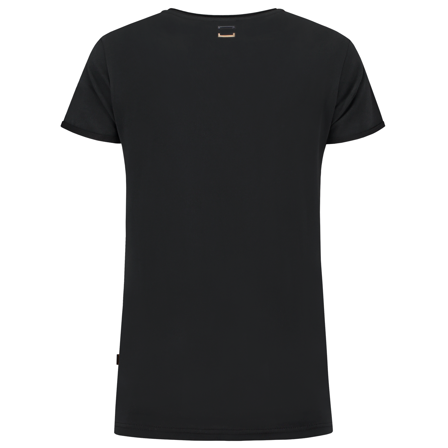 Premium T-shirt met een innovatieve Tricorp look. Het shirt heeft een stiksel over de borst en het Tricorp logo is door middel van een batch op de mouw gezet. De ronde hals en fitted pasvorm geven een modieuze uitstraling aan je werkoutfit. Dankzij de vervaardiging uit gekamd katoen en elastaan blijft de pasvorm van dit shirt altijd mooi. De omgeslagen mouwen zorgen voor een vrouwelijke uitstraling. Premium T-shirts hebben allen een peach finish, wat er voor zorgt dat het product rijker aan voelt.